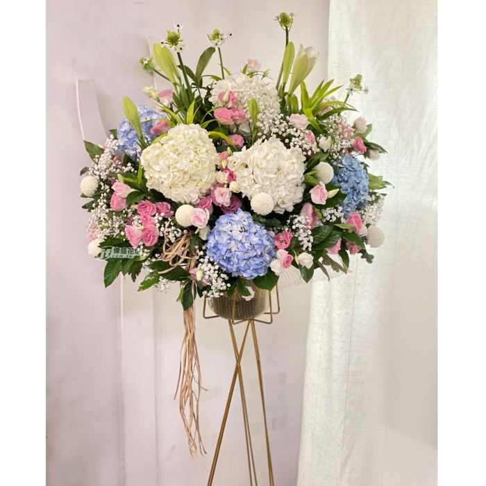 #一個花籃《主材》繡球 桔梗 乒乓菊 滿天星 鐵炮